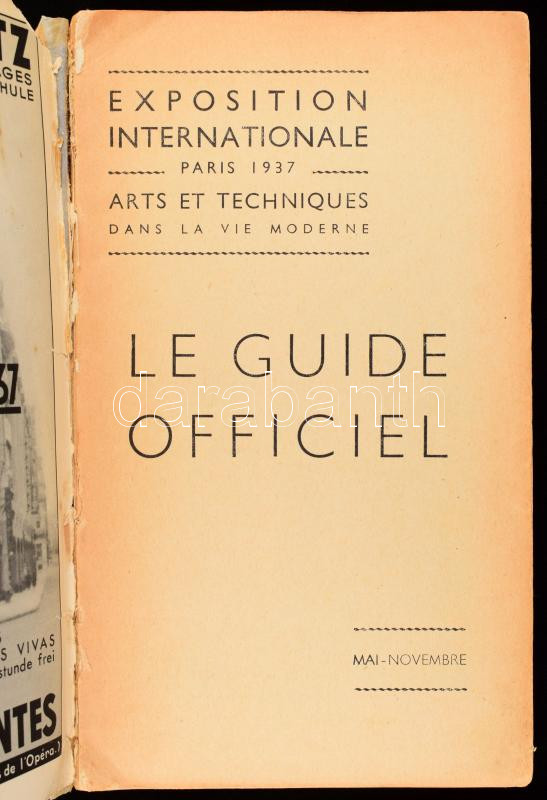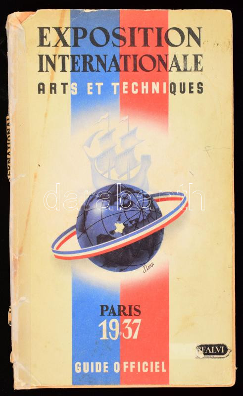 Az 1937-es párizsi világkiállítás hivatalos útmutatója 212 oldalon, igen nívós, többnyire színes képanyaggal, így a 48 kiállító ország pavilonjainak látványos fotóival. A Györgyi Dénes tervezte magyar pavilon - amely kisebb fotón szerepel - teljes építési költsége 2 millió frank volt, ebből Magyarországnak csaknem 1.3 millió frankot kellett előteremtenie. A világkiállítás 1937. májustól decemberig tartott, a Schmid, Bruneton & Morin cég 1938. április 12-én kezdte el a magyar pavilon lebontását. A magyar kiállítás kormánybiztosa Tormay Géza (az író Tormay Cécile testvére), helyettese Teleki Andor volt. Kiadói papírkötés, gerinc ragasztott, laza fűzés, kopottas állapotban.