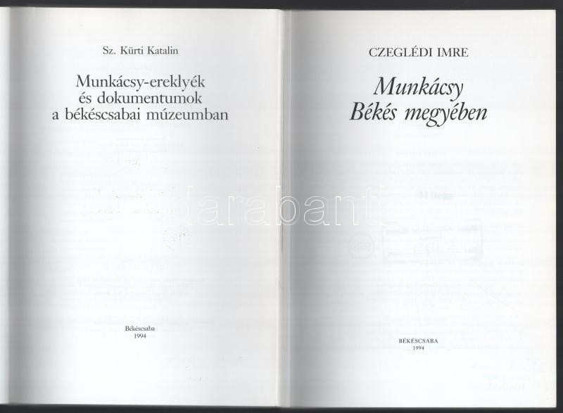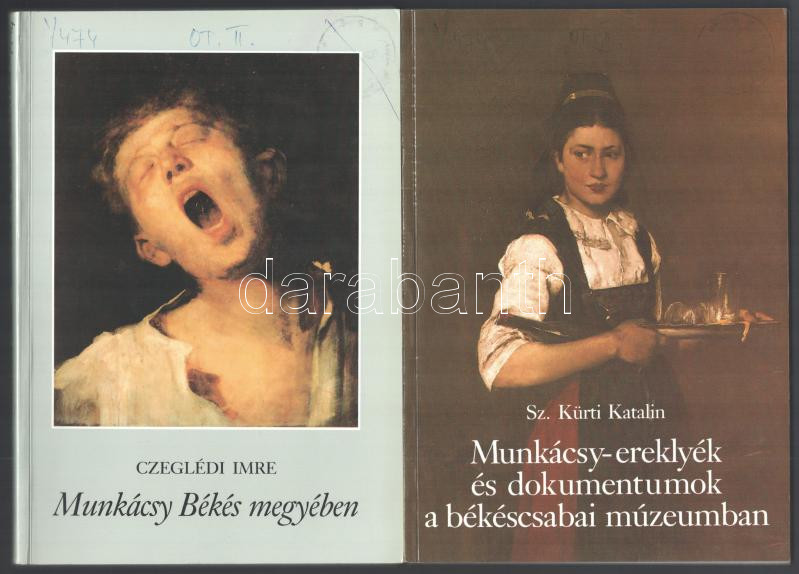 Munkácsy Mihállyal kapcsolatos 2 db kötet: Czeglédi Imre: Munkácsy Békés megyében. Békéscsaba, 1994, Békés Megyei Múzeumok Igazgatósága. Fekete-fehér illusztrációkkal. Kiadói papírkötésben, volt könyvtári példány. + Sz. Kürti Katalin: Munkácsy-ereklyék és dokumentumok a békéscsabai múzeumban. Békéscsaba, 1994, Békés Megyei Múzeumok Igazgatósága. Fekete-fehér képekkel gazdagon illusztrált. Kiadói papírkötésben, volt könyvtári példány