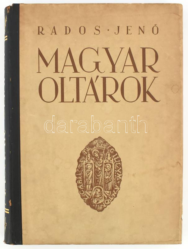 Rados Jenő: Magyar oltárok. A szerző, Rados Jenő (1895-1992) építész, építészettörténész által Tobiás László (?-1957) okl. építész, a budapesti Felsőépítőipari Iskola igazgató részére DEDIKÁLT példány! Bp., 1938, Kir. M. Egyetemi Nyomda, 93+3 p.+CLXXI t.+3 p. Gazdag szövegközi és egészoldalas, fekete-fehér képanyaggal illusztrált. Kiadói aranyozott gerincű félbőr-kötés, kopott, kissé foltos borítóval, a gerincen kis sérüléssel.
