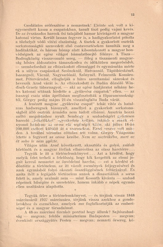 Szabó Árpád, a Szabadpolgári Kör elnöke 1937. márciusi ünnepi beszéde. A szerző megvizsgálja az 1848-as forradalomhoz vivő utat, deklarálja annak békés természetét, amely egészen addig békésnek mutatkozott, amíg a bécsi érdekek nyomására a nemzetiségi haderők fel nem keltek a forradalom ellen; a későbbi összecsapások idején pedig az osztrák birodalmi haderő önmagában nem volt képes a magyar szabadságharccal szembe szállni, leveréséhez külső, orosz segítséget vett igénybe. Szabó Árpád ünnepi beszéde természetesen erősen áthallásos, számos üzenete a trianoni békediktátummal sújtott jelenkori magyarsághoz szól.