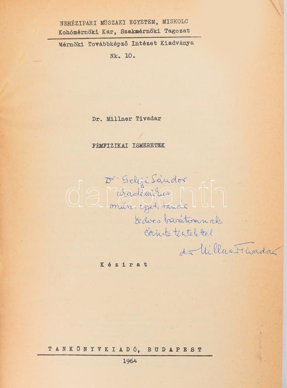 Dr. Millner Tivadar: Fémfizikai ismeretek. Kézirat.