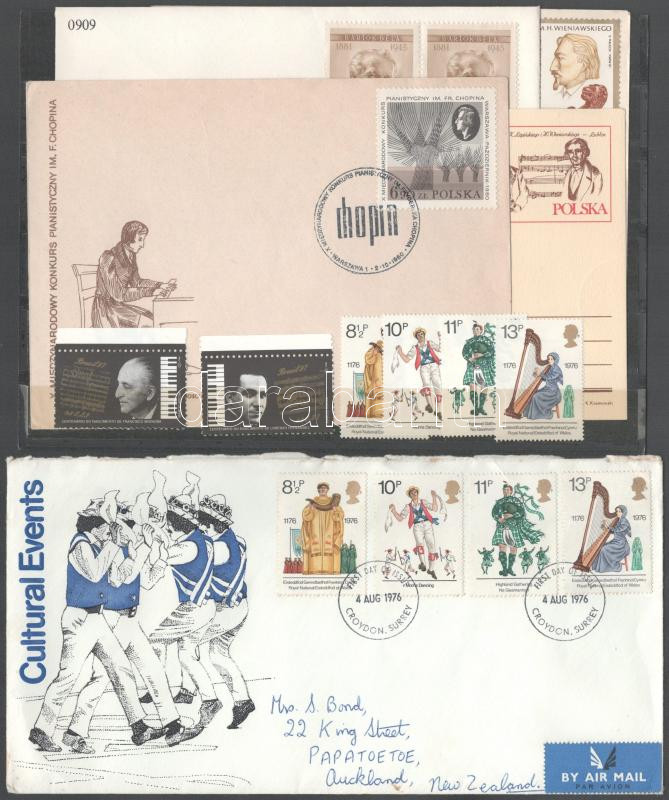 Kis zene motívum összeállítás, benne bélyegek, futott légi levél stb. https://www.darabanth.com/de/498-Fernauktion/498.0/Erlesene-Lose-und-Sammlungen-Ausland/Sammlungen-und-Lots-Weltweit~2500013/Kis-zene-motivum-osszeallitas-benne-belyegek-futott-legi-level-stb~II3400584