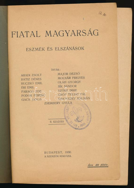 1930 Bp., Fiatal magyarság - Eszmék és elszánások; Sík Sándor, Gróf Te... https://www.darabanth.com/de/498-Fernauktion/498.0/Kunst-Dokumente-andere-Sammelgebiete/Drucksachen~500019/1930-Bp-Fiatal-magyarsag-Eszmek-es-elszanasok-Sik-Sandor-Grof-Teleki-Pal-es-masok-C3~II3398250
