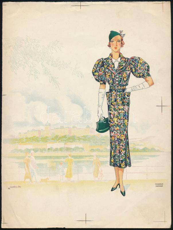 cca 1936 Pál György (1906-1986): Női divatillusztráció, háttérben a Duna és a Budai vár látképével. Próbanyomat (tükrözött). Bp., Globus-ny., 26,5x20 cm