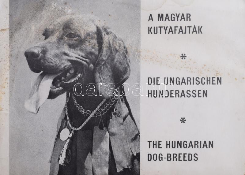 cca 1970 A magyar kutyafajták. A Magyar Ebtenyésztők Országos Egyesülete és a MAVAD (Magyar Vadkereskedelmi Szövetkezeti Vállalat) ismertető kiadványa az exportra szánt kutyafajtákról (vadász- és terelőkutyák). Fekete-fehér fotókkal illusztrálva, magyar, német és angol nyelven. Kiadói tűzött papírkötés, a borító ázott, foltos, belül nagyrészt jó állapotban, 32 p.