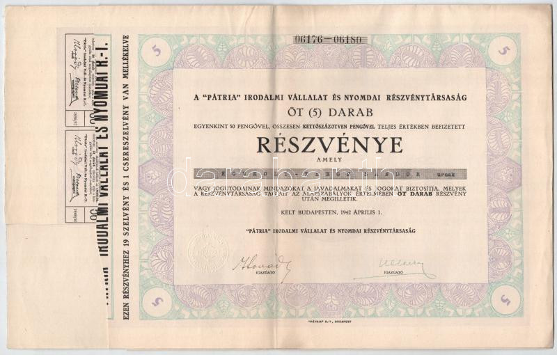 1942 Budapest " 'Pátria' Irodalmi Vállalat és Nyomdai Részvénytársaság" öt névre szóló részvénye egyben, összesen 250P-ről, szelvényekkel, szárazpecséttel, "06176-06180" T:XF