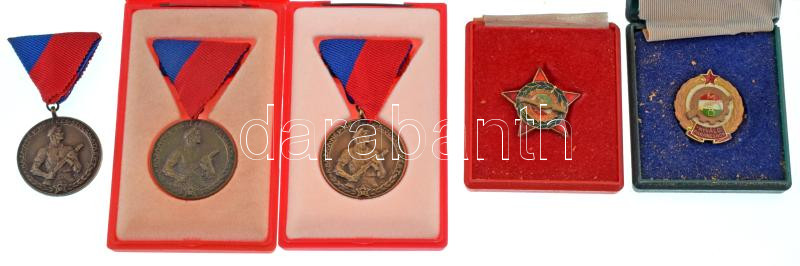 Beschreibung: 1964. "Munkásőr Emlékérem" bronz kitüntetés mellszalagon (3db, ebből 2db eredeti tokban) + "Munkásőr" műgyantás ötéves szolgálati jelvény sérült tokban + "Munkásőrség - Kiváló Parancsnok" műgyantás jelvény sérült tokban T:AU