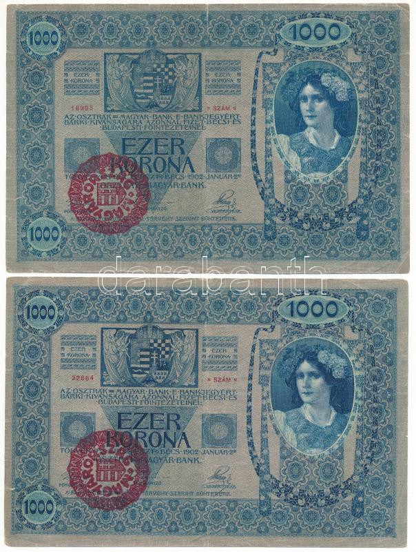 1902. 1000K piros "MAGYARORSZÁG" felülbélyegzéssel (2x) T:F ... https://www.darabanth.com/de/498-Fernauktion/498.0/Numismatik/Ungarische-Banknoten~1000097/1902-1000K-piros-MAGYARORSZAG-felulbelyegzessel-2x-TF-beszakadasok3Cbr-3E-Adamo-K35B~II3400390