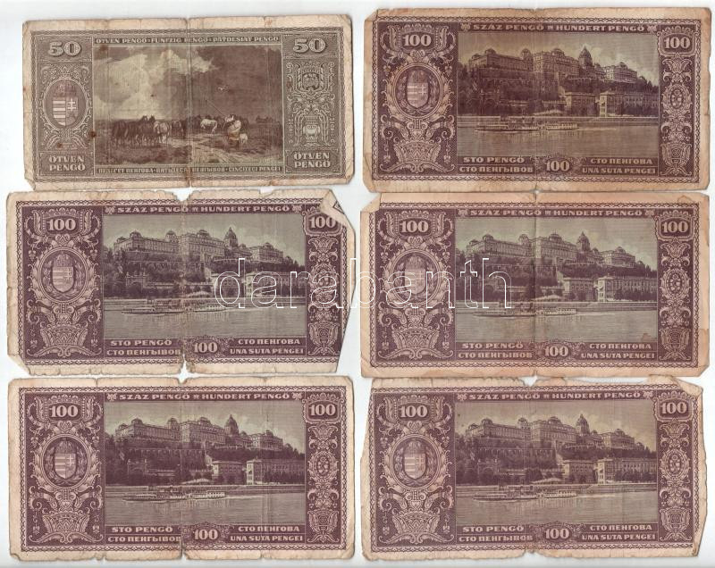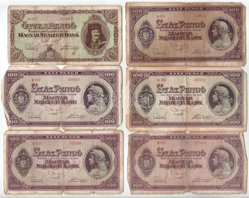 Adamo P15, P18 https://www.darabanth.com/de/498-Fernauktion/498.0/Numismatik/Ungarische-Banknoten~1000097/1945-50P-plus-100P-5x-TVG-G3Cbr-3E-Adamo-P15-P18~II3277941