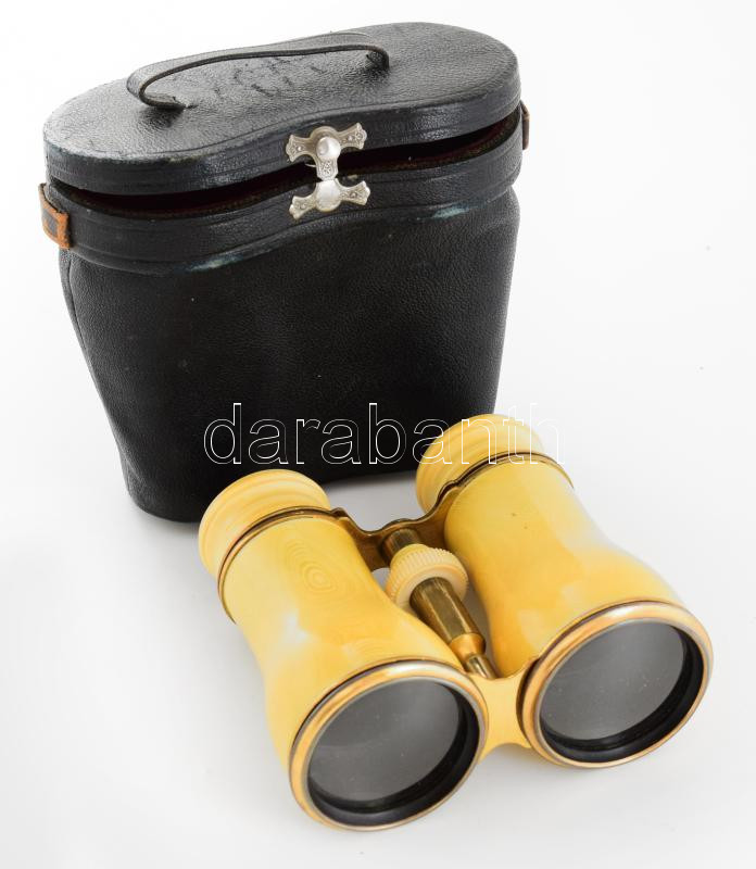 Beschreibung: cca 1900 Simon Waldstein színházi látcső, jelzett a távcsőn, jelzett a tokban, repedésvonallal, 10,5x12 cm