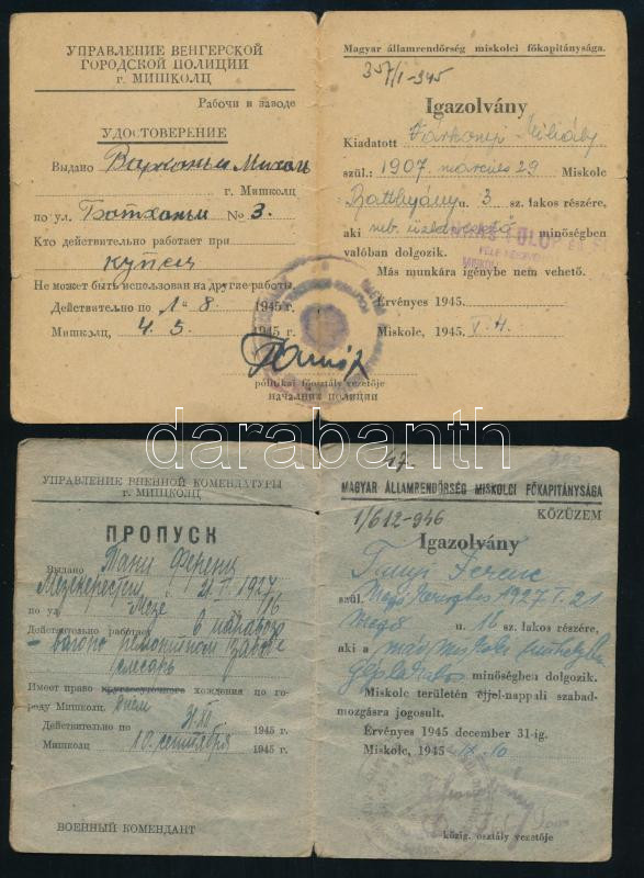 Beschreibung: 1945 Miskolc, a magyar államrendőrség miskolci főkapitánysága által kiállított 2 db magyar-orosz nyelvű igazolvány