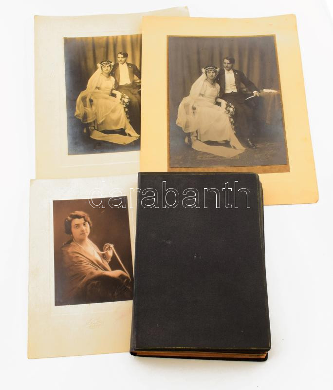 cca 1920-1930 Régi fotóalbum összesen kb. 30-40 db fotóval, főként családi képek, gyerekeket ábrázoló fotók, vegyes méretben és állapotban + 3 db nagyobb méretű fotó, 15x10 cm és 23x17 cm között