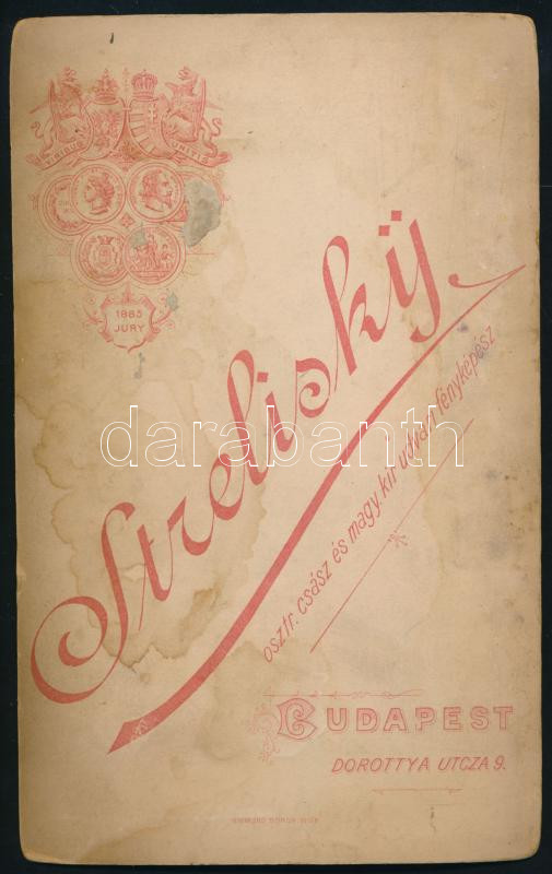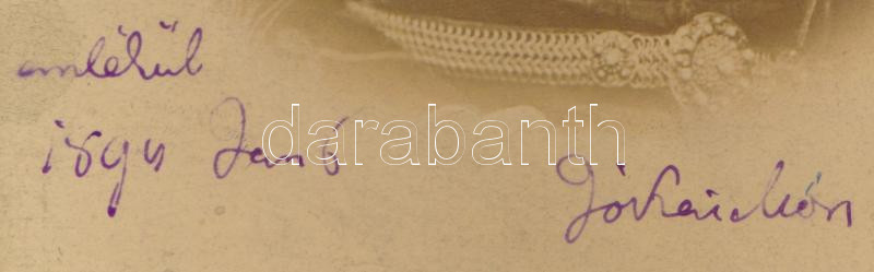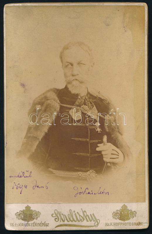 1894 Jókai Mór (1825-1904) író, országgyűlési képviselő, főrendiházi tag díszmagyaros portréja, a képen autográf aláírásával és soraival (,,emlékül 1894 jan 6 Jókai Mór"). Kabinetfotó Strelisky cs. és kir. udvari fényképész budapesti műterméből, ázásnyomokkal, kissé vetemedett, 18x11 cm