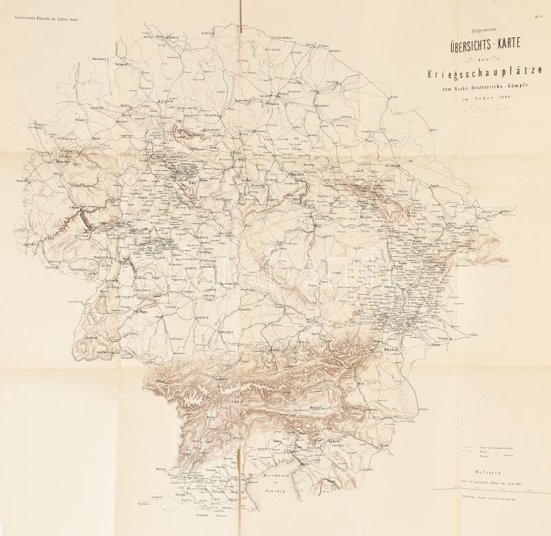 1866 A porosz-osztrák-olasz háború térképe. Litográfia szakadásokkal 62x59 cm / Map of the Prussian-Italian-Austrian war with tears. Allgemeine Übersichts Karte der Kriegsshauplatze - zum Werke: Österreichs Kämpfe im Jahre 1866.