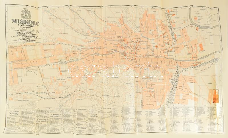1928 Miskolc thjf. város térképe. Tervezték: Szűcs Sándor és Dr. Vigyázó János, készítette: Tóvári János. 1 : 10.000. Bp., Turistaság és Alpinizmus kiadása (M. kir. állami ny.), jó állapotban 73x45 cm