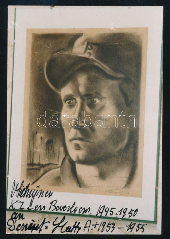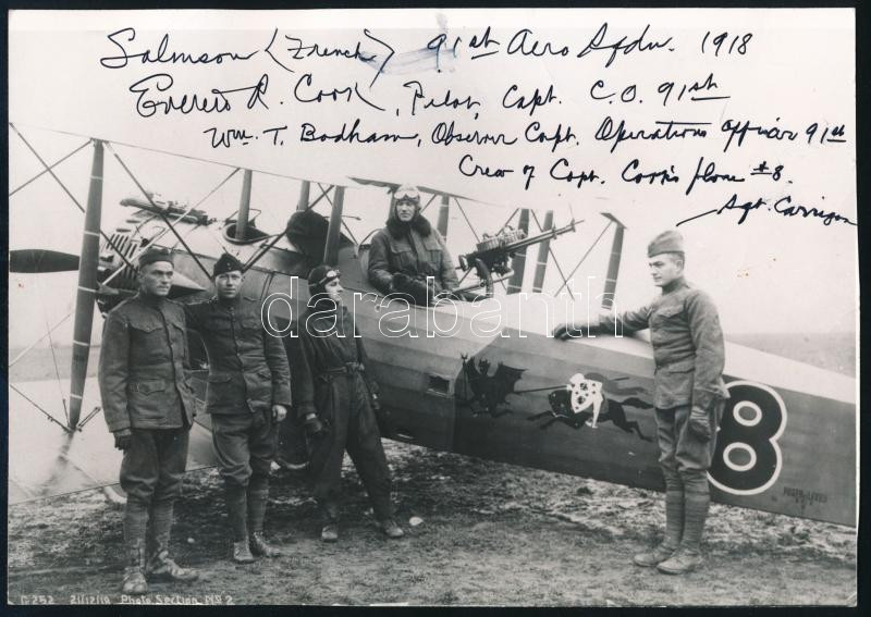 Az I. világháborúban szolgált amerikai 91. repülőszázad (91st Aero Squadron) tagjai Everett Richard Cook századparancsnokkal, nagyméretű fotó (modern előhívás), rajta kézzel írt feliratokkal, 17x24 cm + II. világháborús német katonai témájú fotó, rajta beazonosítandó, kézzel írt sorokkal, 13x9 cm