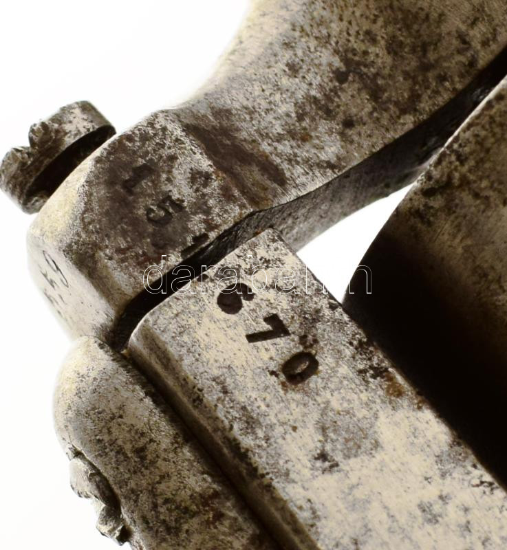 Lefaucheux-rendszerű, hatlövetű forgótáras revolver, cca. XIX. sz. közepe-második fele, jelzett: "E[ugene] Lefaucheux Breveté", sorozatszámmal, korának megfelelő állapotban, rozsdafoltokkal, 24x14 cm // Antique Lefaucheux revolver, marked, with rust stains