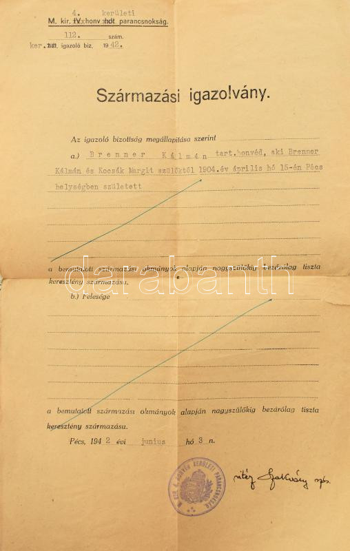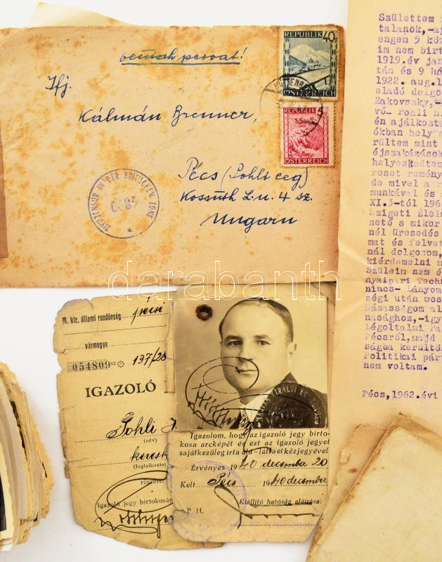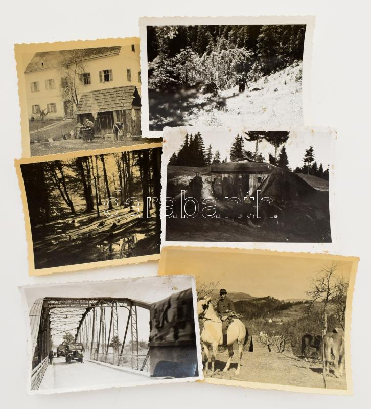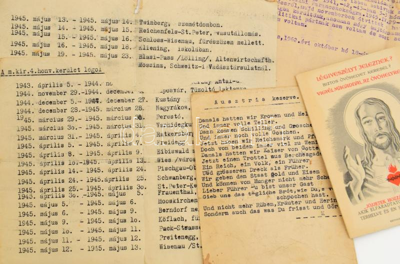 Tartalmas II. világháborúhoz fűződő fotó- és papírrégiség tétel: több mint 100 db fotó a háború idejéből (főként Ausztriában készült, vegyes felvételek), iratok (Pohli Henrik kereskedő fényképes igazolványa, Brenner Kálmán tart. honvéd származási igazolványa, levelei, stb.), változó állapotban, érdekes, átnézendő anyag!