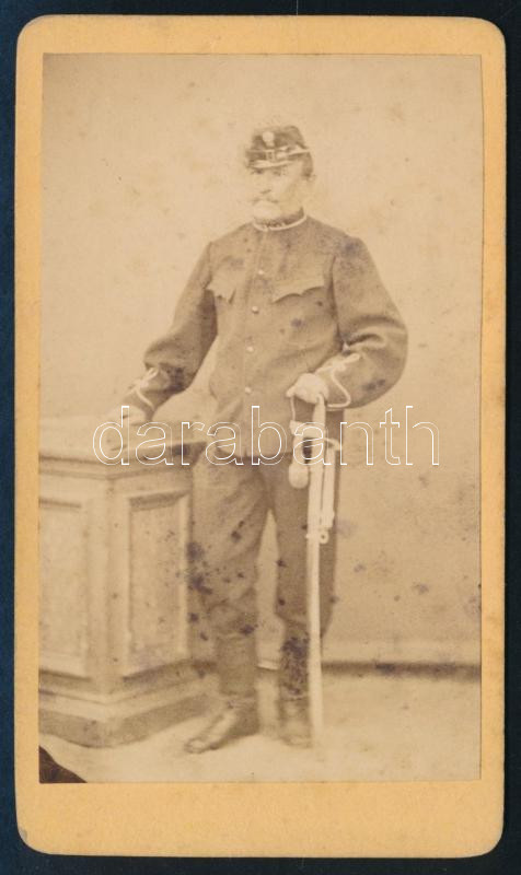 Beschreibung: cca 1870 Katonatiszt egészalakos portréja szablyával, vizitkártya, a verzón "Chr. Walter" bélyegzéssel, kissé foltos, 10,5x6 cm