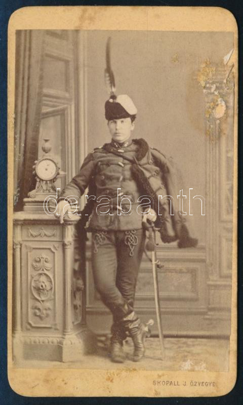 cca 1875 Díszes öltözetű, darutollas sapkát viselő tiszt (testőr?) portréja, vizitkártya Skopáll J. özvegye (Győr-Mosonmagyaróvár) műterméből, kissé sérült, foltos, 10,5x6 cm