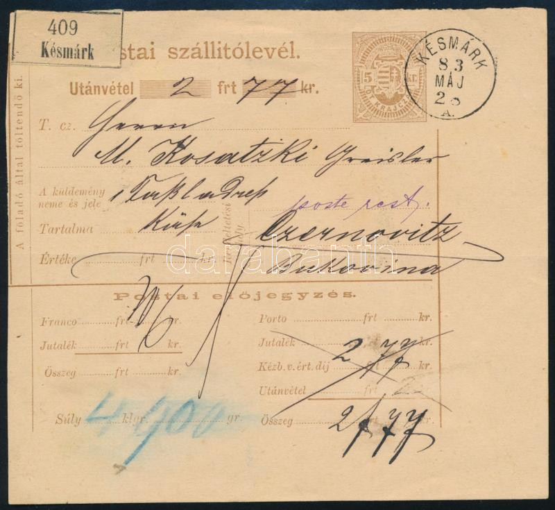Beschreibung: 1883 Postai utánvételes szállítólevél 5kr illetékjeggyel "KÉSMÁRK" - "CZERNOWITZ"