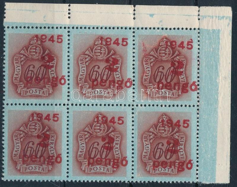 Beschreibung: 1945 Kisegítő portó 2P/60f ívsarki 6-os tömb eltolódott felülnyomással