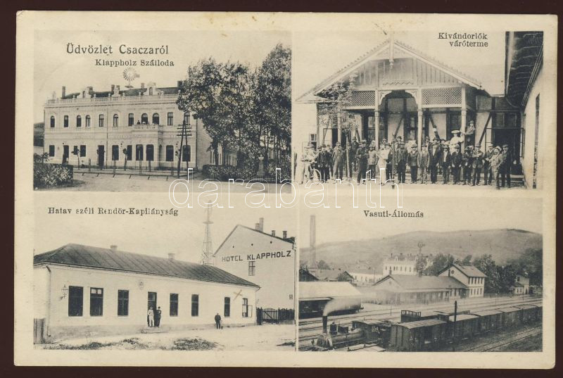 Csacza Wartesaal für Auswanderer, Bahnhof, Polizei, Hotel https://www.darabanth.com/de/5-Gross-Auktion/5.1/Ansichtskarten-Ungarn/~1324/Csacza-Wartesaal-fur-Auswanderer-Bahnhof-Polizei-Hotel~II73497