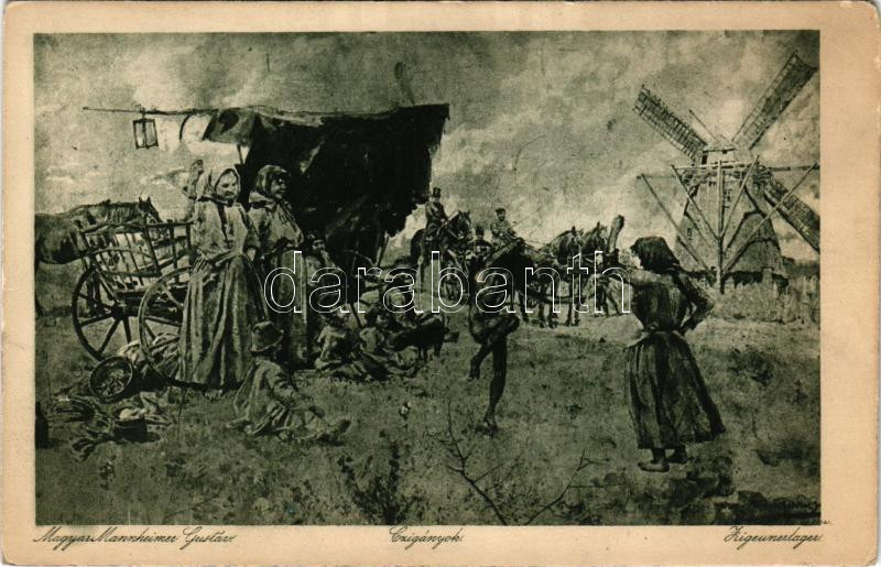 Cigányok, szélmalom, folklór / Zigeunerlager / Hungarian art postcard, Gypsy folklore, windmill. s: Magyar Mannheimer Gusztáv. Magyar Rotophot Társaság, Budapest VI. Nr. 1603/2