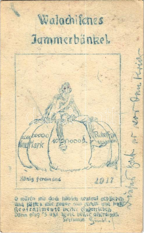 1917 Walachisches Jammerbänkel, König Ferdinand. Feldpostkorrespondenzkarte / egyedi, kézzel rajzolt első világháborús osztrák-magyar tábori postai levelezőlap, karikatúra, Ferdinánd király / hand-drawn WWI Austro-Hungarian K.u.k. military field postcard, caricature, King Ferdinand + "Tábori postahivatal 647"