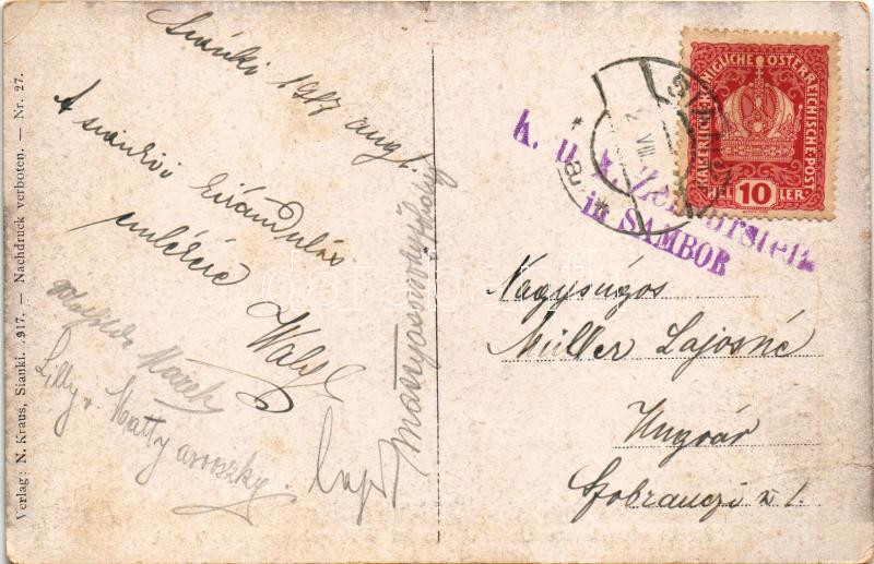 Syanky, Sianky, Sianki; Starke ausgebaute Unterkünfte im Waldgebirge / katonai szálláshely az erődben / WWI military camp in the forest mountains + "K.u.k. Zensuriert in Sambor" (EB)