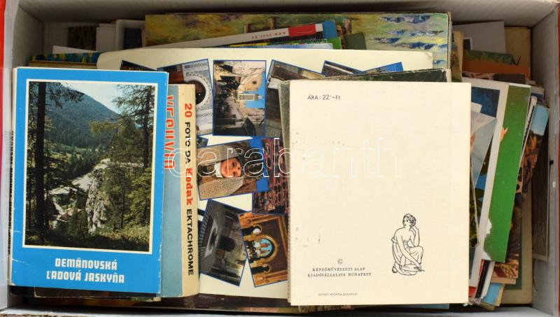 Kb. 200 db MODERN vegyes képeslap tétel cipősdobozban: üdvözlőlapok, városok, reklám, művészlapok, több képeslapfüzet / Cca. 200 modern mixed postcard lot in a shoe box: greetings, towns, advertisements, art postcards, many booklets