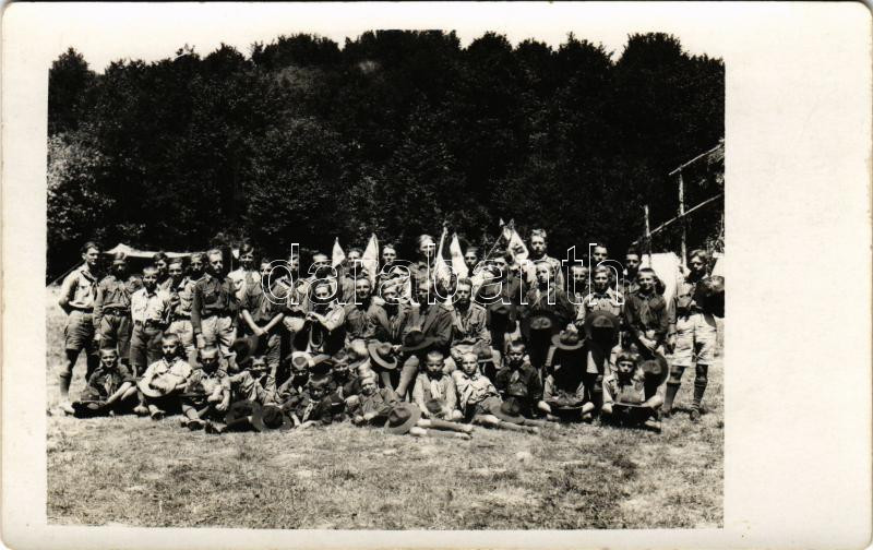 Beschreibung: 1930 Pénzeskút (Pénzesgyőr, Zirc mellett), cserkész tábor, csoportkép. photo