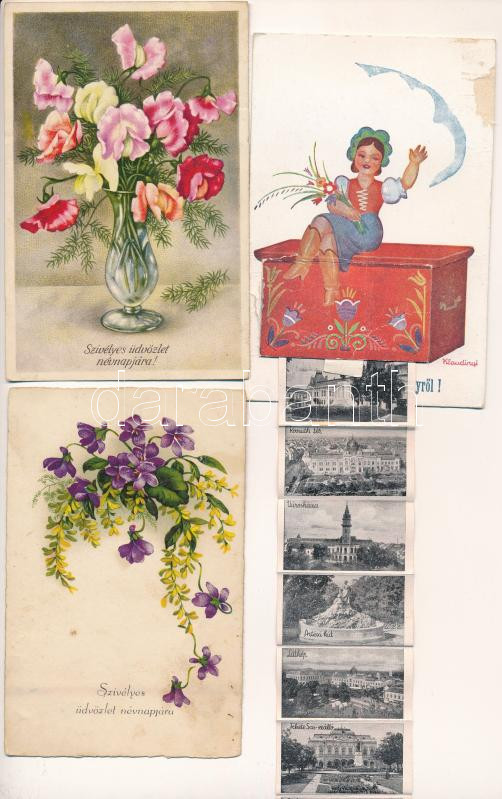 Beschreibung: 13 db RÉGI üdvözlő képeslap, főleg virágok / 13 pre-1945 greeting art postcards, mainly flowers