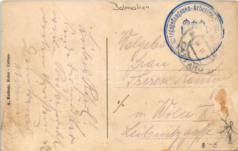 A Magyar-Horvát Tengeri Gőzhajózási Rt. "Gödöllő" egycsavaros tengeri személyszállító és áruszállító gőzhajója a kotori öbölben / Ungarisch-Kroatische See-Dampfschiffahrts-A.-G. / Ungaro-Croata Steamship Company's "Gödöllő" sea passenger and cargo steamship in the Bay of Kotor (Bocche di Cattaro) + "K.u.k. Kriegsgefangenen-Arbeiter" (Rb)