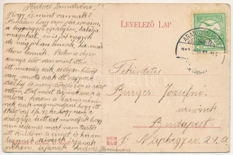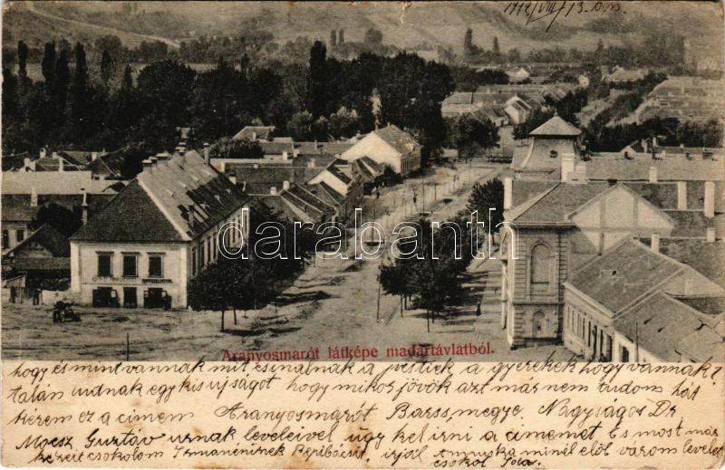 1912 Aranyosmarót, Aranyos-Maróth, Zlaté Moravce; látkép, Rakovszky István üzlete, könyv- és papírkereskedés. Brunczlik Imre kiadása / general view, shops (kis szakadás / small tear)