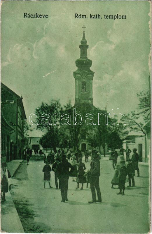 Beschreibung: Ráckeve, Római katolikus templom, Farkas János üzlete. Hangya szövetkezet kiadása (EK)