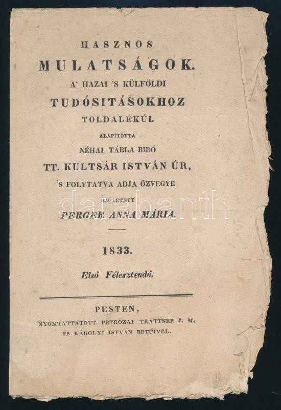 Perger Anna Mária: Hasznos mulatságok. A' hazai 's külföldi ... https://www.darabanth.com/de/500-Fernauktion/500.0/Bucher/Bucher-Andere-kuriositaten~2500135/Perger-Anna-Maria-Hasznos-mulatsagok-A-hazai-s-kulfoldi-tudositasokhoz-toldalekul-AlapC3~II3406829