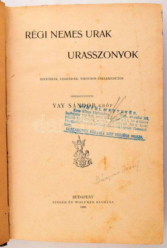 Vay Sándor gróf: Régi nemes urak, urasszonyok. Históriák, legendák, virtusos cselekedetek. Bp., 1900., Singer és Wolfner, 373+3 p. Átkötött félvászon-kötésben, kopott borítóval, a gerincen címkenyomokkal, a címlapon bélyegzéssel.