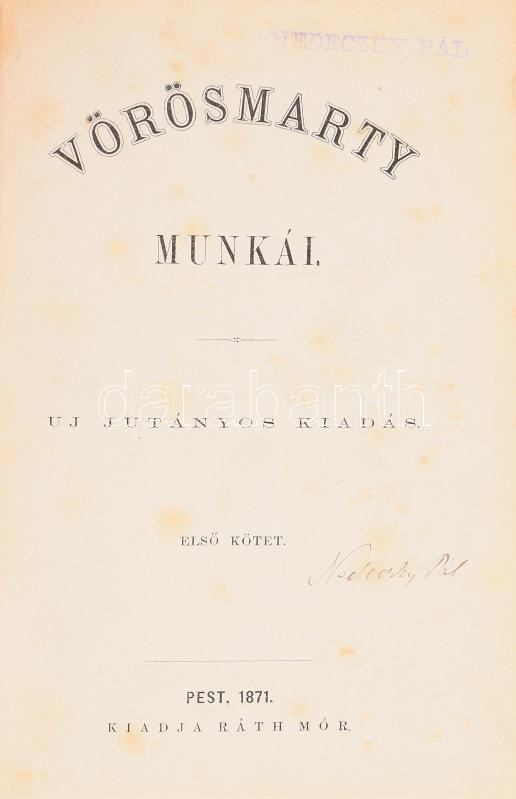 Vörösmarty munkái. Első kötet. Pest, 1871, Ráth Mór. Félvászon kötés, ... https://www.darabanth.com/de/500-Fernauktion/500.0/Bucher/Bucher-Andere-kuriositaten~2500135/Vorosmarty-munkai-Elso-kotet-Pest-1871-Rath-Mor-Felvaszon-kotes-kopottas-allapotba~II3404752