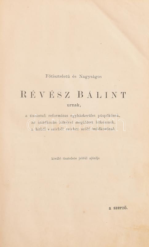 Csiky Lajos: Hit, remény, és szeretet könyve. Az élet kedvező és kedvezőtlen napjaira. Imádság a magyar protestáns nép számára. Bp., 1884, Hornyánszky Viktor, XII+12 (családi emléklapok)+398 p. Korabeli egészvászon-kötés, kopott borítóval, hiányzó, sérült gerinccel, foltos lapokkal.