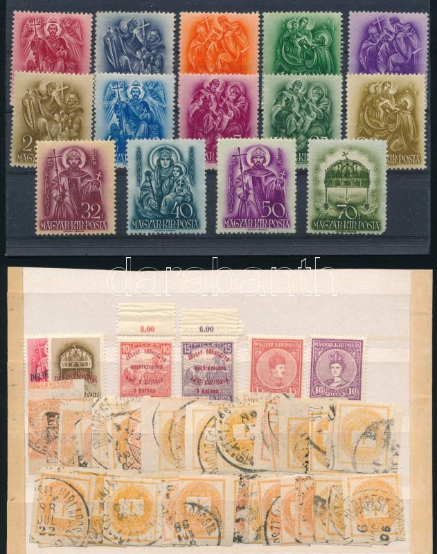 Beschreibung: 1945 előtti sorok és önálló bélyegek, köztük Krajcáros Hírlapbélyegek is, 2 stecklapon