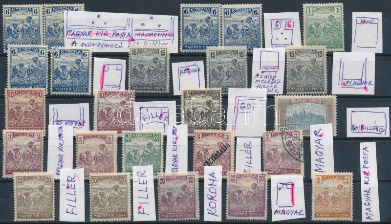 Beschreibung: 24 db Arató-Parlament bélyegek lemez- illetve nyomási hibákra beazonosítva az 1920-as évekből, stecklapon