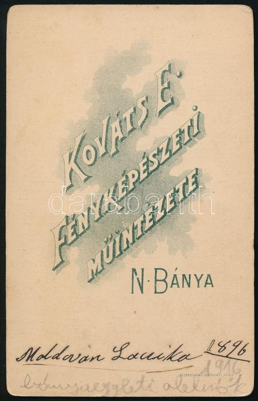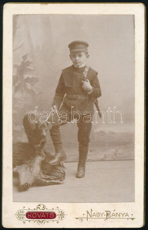 1896 Fiatal fiú kutyával (Moldován Lacika, később bányaegyleti alelnök), vizitkártya Kováts Elek nagybányai (Baia Mare) műterméből, a hátoldalon feliratozva, 10,5x6,5 cm (Ritka műterem!)