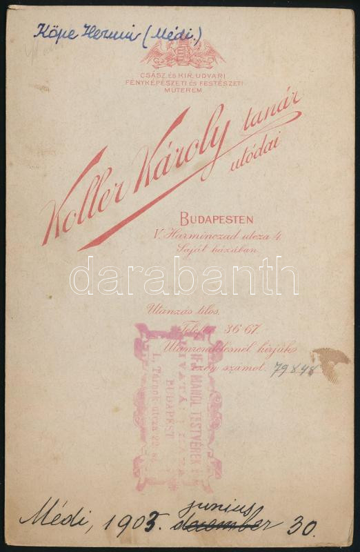 1903 Köpe Hermin (Médi), Köpe Viktor író lányának portréja, kabinetfot... https://www.darabanth.com/de/500-Fernauktion/500.0/Fotografie/Foto~1000005/1903-Kope-Hermin-Medi-Kope-Viktor-iro-lanyanak-portreja-kabinetfoto-Koller-Karoly-tanar-utodai~II3408819