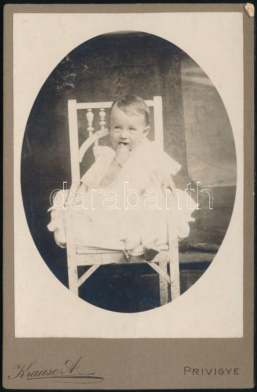 cca 1900-1910 Privigye, Gyermekportré, keményhátú fotó, Krause A. privigyei (Prievidza/Priwitz) műterméből, az egyik felső sarkán kis felületi sérüléssel, 16x10 cm