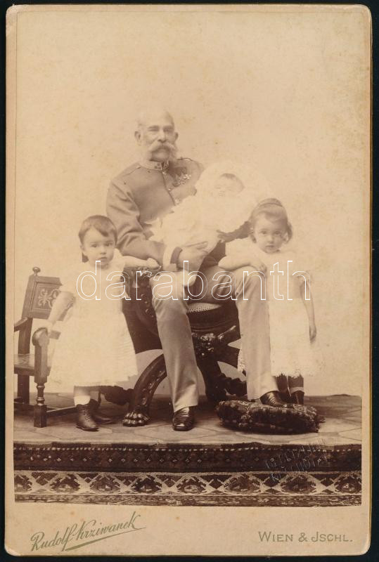 cca 1900 I. Ferenc József (1830-1916) császár és király unokáival, Mára Valéria (1868-1924) főhercegnő, magyar és cseh király hercegnő első három gyermekével, Erzsébet Franciska főhercegnővel (1892?1930), Ferenc Károly Szalvátor (1893?1918), és Hubert Szalvátor főherceg (1894?1971) hercegekkel, Wien - Ischl, Rudolf Krziwanek, a felületén kis foltokkal, 16x11 cm
