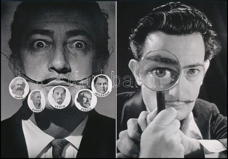 cca 1950 Dali, Salvador (1904-1989) katalán - spanyol szürrealista festőművész, aki fényképezés közben gyakran önmagát rendezte, vagyis kitalálta előre a képet, s ehhez hívott fotós segítséget, eltérő időben készült felvételek (Bajusz-galéria; Dali szeme mindent lát!), 2 db modern nagyítás, jelzés nélkül, 21x15 cm