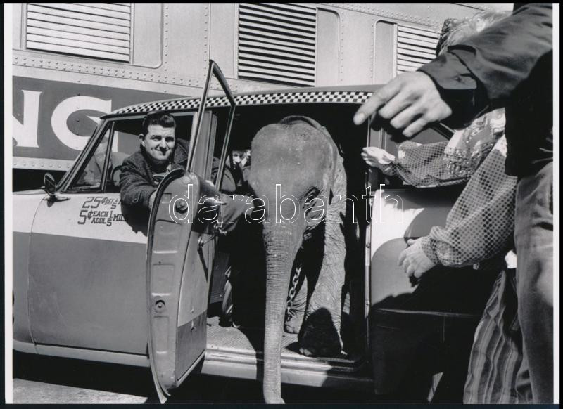 Beschreibung: cca 1964 A kiselefánt taxival érkezik a cirkuszi fellépésre, 1 db modern nagyítás, jelzés nélkül, 15x21 cm