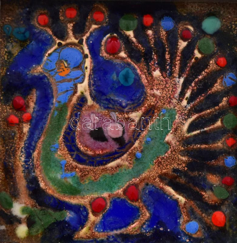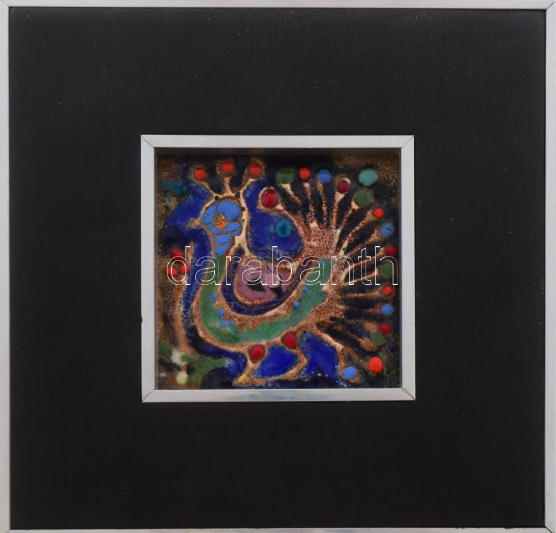 Buzás Árpád: Páva. Tűzzománc kép, keretezett, hibátlan, jelzés nélkül, 9,5x9,5 cm, kerettel 21,5x21,5 cm