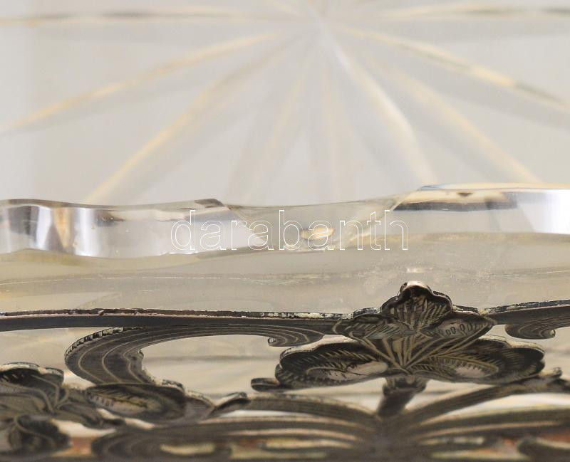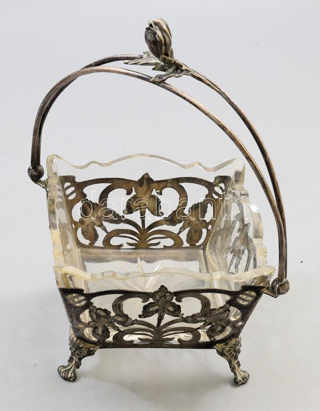 Beschreibung: Szecessziós ón kínáló, üveg betéttel, lepattanással, 16x16x24 cm